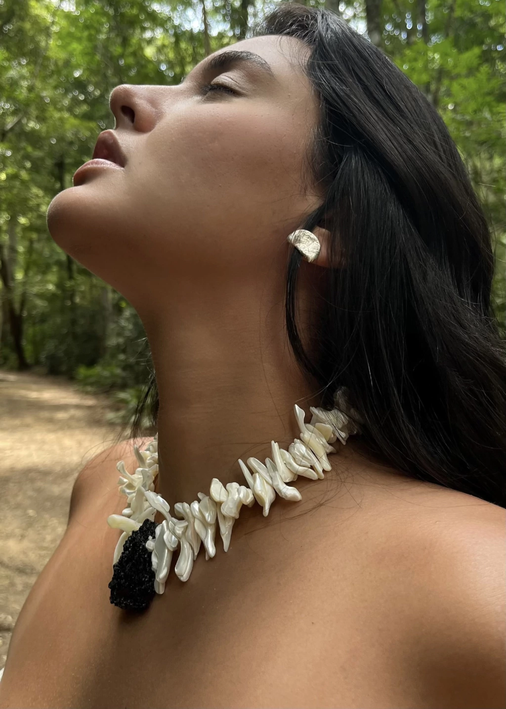 Mais do que um acessório, uma obra de vestir. O Colar Rainha é uma criação única de Brasilis Drop II, onde arte e natureza se encontram em perfeita harmonia. Feito à mão com materiais cuidadosamente selecionados — pedra bruta de Turmalina Negra e Madrepérolas, carregando naturalidade e texturas que narram sensações —, cada detalhe carrega a essência do feito com alma.